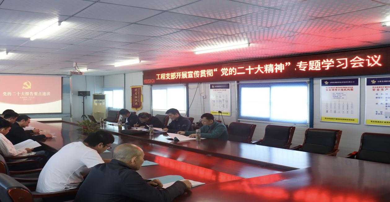 工程支部:11月1日,在项目部会议室召开支部委员会会议,按照支部实际情况进行党的二十大学习宣传工作的安排;11月9日,在项目部会议室开展主题党日活动,集中学习习近平总书记代表第十九届中央委员会向中国共产党第二十次全国代表大会作的题为《高举中国特色社会主义伟大旗帜,为全面建设社会主义现代化国家而团结奋斗》的报告;3个党小组会议分别在11月10日、11月11日、11月14日召开,主要议题分别是:凝聚磅礴力量,绽放绚丽之花;砥砺奋进,不断前行,为新时代书写壮美篇章;坚定党性信念,保持清醒头脑。