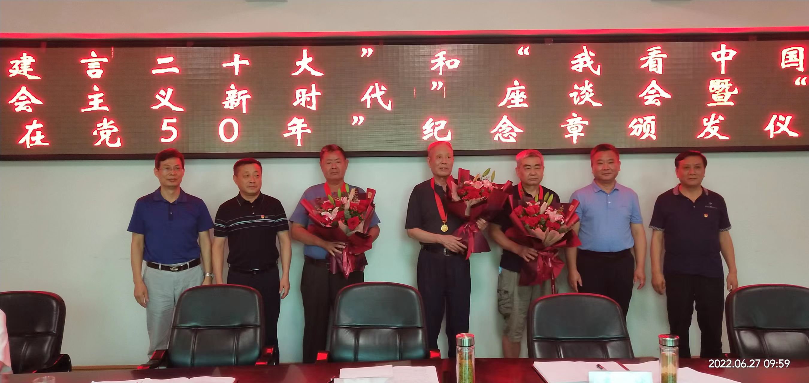 6月27日,合肥公路管理服务中心举办“光荣在党50周年”纪念章颁发仪式,为巢湖路桥吴经平、金存保两名党员同志颁发纪念章。他们在党爱党、在党为党,忠诚了一辈子,奉献了一辈子。纪念章上,红色与金色相衬,党徽、五角星、旗帜、丰碑、向日葵等在灯光下闪耀,老党员们嘴角露出笑容,用手触摸着纪念章,脸上的皱纹里写满骄傲。