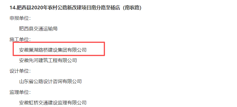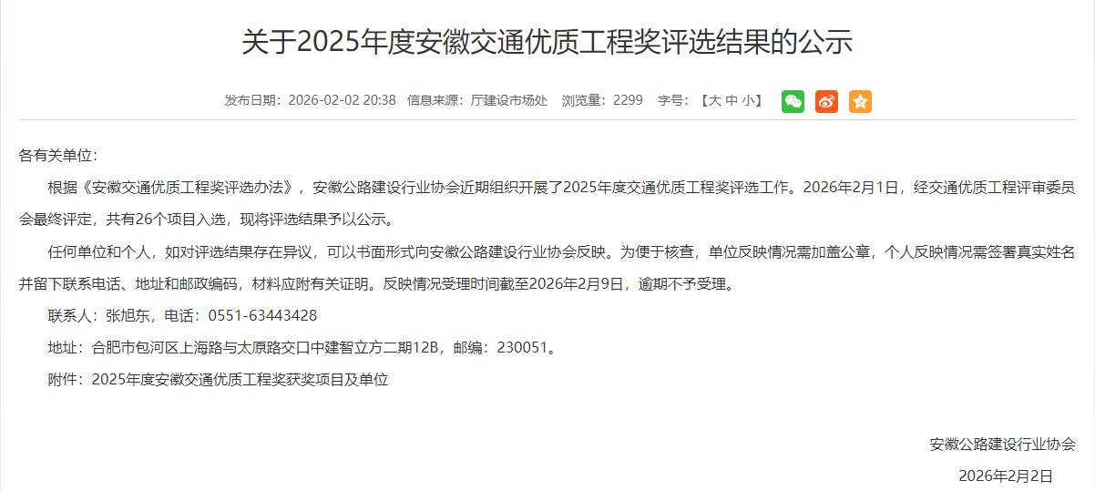 22日,安徽公路建设行业协会正式公布2025年度安徽交通优质工程奖评选结果,由安徽巢湖路桥建设集团有限公司承建的S11芜湖至黄山高速公路与肥西县2020年农村公路新改建项目南分路至杨店(南农路)成功跻身获奖名单,实现“一企双奖”的亮眼成绩。