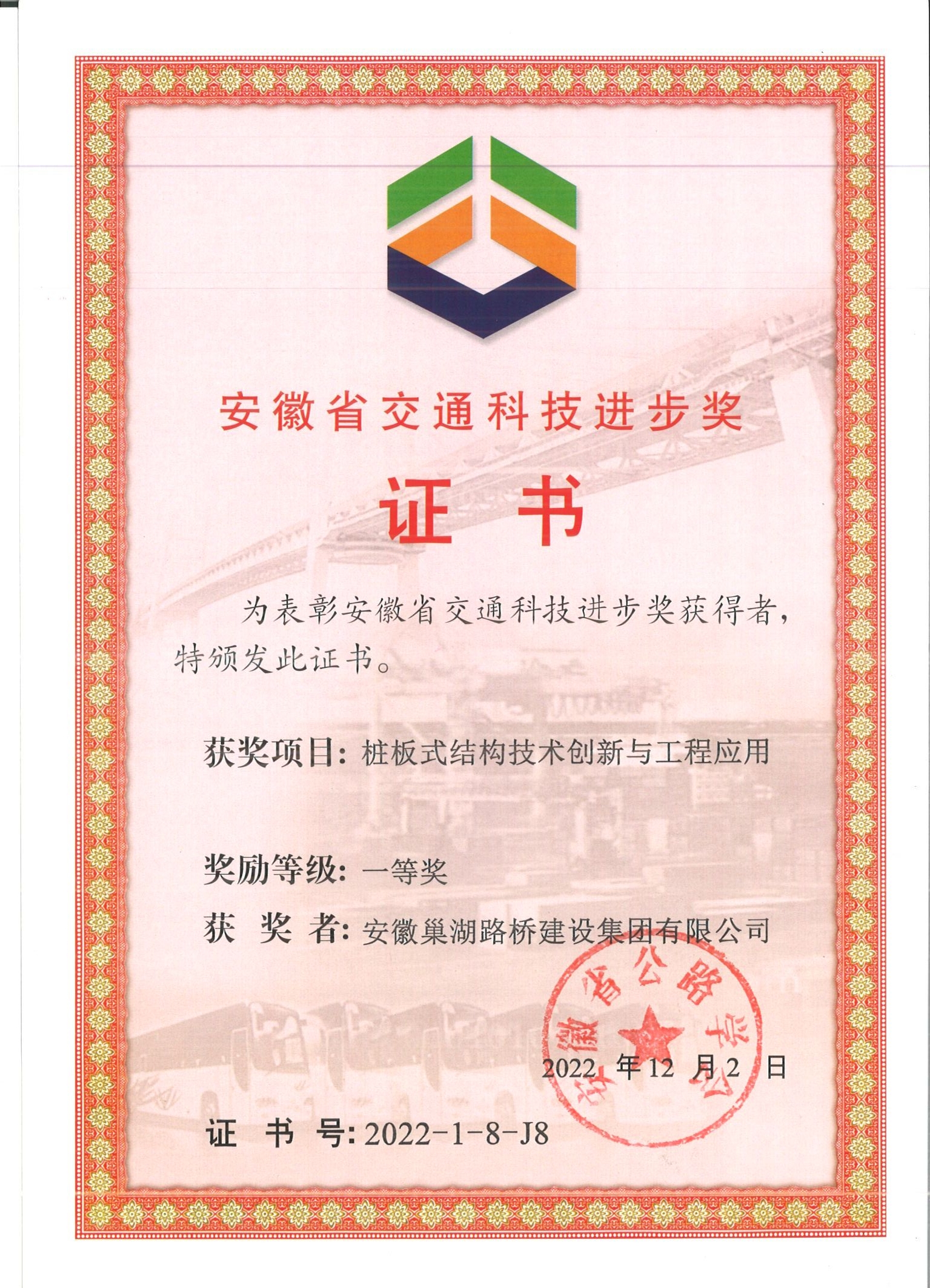 喜讯!集团公司荣获安徽省交通科技进步奖一等奖