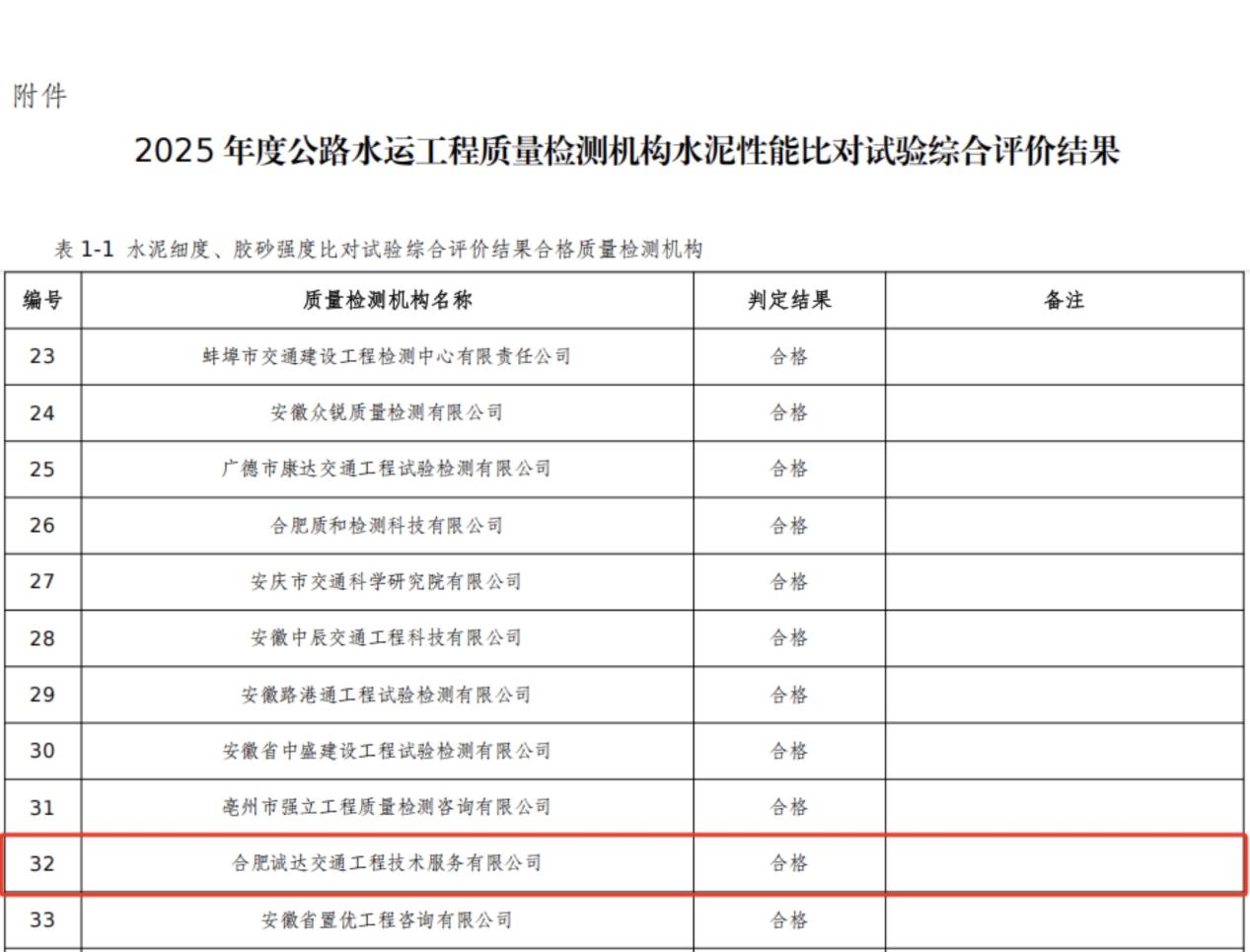 9月9日,安徽省交通工程质量安全管理服务中心正式印发《关于公布安徽省2025年度公路水运工程质量检测机构水泥性能比对试验结果的通知》(皖交质安函〔2025〕64号)。合肥诚达交通工程技术服务有限公司凭借精准的检测数据、规范的操作流程及完整合规的资料提交,在全省69家参比检测机构中脱颖而出,成功入选“合格”名单,标志着公司在水泥性能检测领域的技术能力与管理水平获省级权威认可。